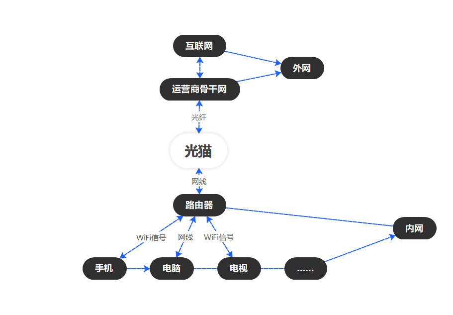 虽然光猫也可以产生WiFi信号,但是由于不是每家都会光纤入户,以及碍于光猫狗屎感人的性能,绝大多数家庭的网络链路应该是这样的: